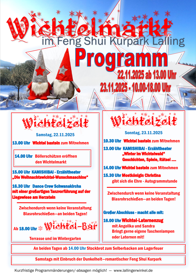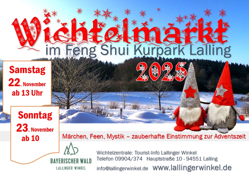 Das Motto "Märchen, Feen, Mystik" zieht sich wie ein roter Faden durch den Wichtelmarkt im Lallinger Winkel, der im zauberhaften Ambiente des Feng Shui Kurparks stattfindet. In entsprechend dekorierten Holzhütten werden winterliche und vorweihnachtliche Waren angeboten, es gibt wärmende Getränke und leckere Speisen, die von den örtlichen Vereinen kredenzt werden. Lassen Sie sich verzaubern vom romantischen Lichtermeer rund um den See und dem entsprechenden Rahmenprogramm für Groß und Klein!