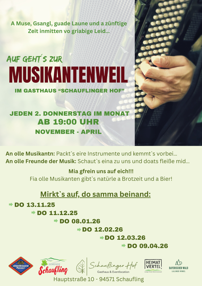 Jeden zweiten Donnerstag im Monat treffen sich Musikanten und Freunde der Musik im Gasthaus "Schauflinger Hof" zu einem gemütlichen Stelldichein. Für die Musikanten gibt's a Brotzeit und a Bier!
